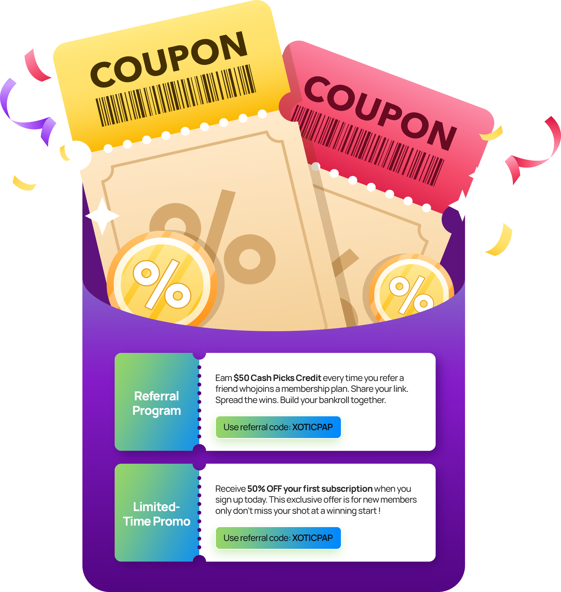 Receive 50% OFF your first membership when you sign up today. This exclusive offer is for new members only don’t miss your shot at a winning start!